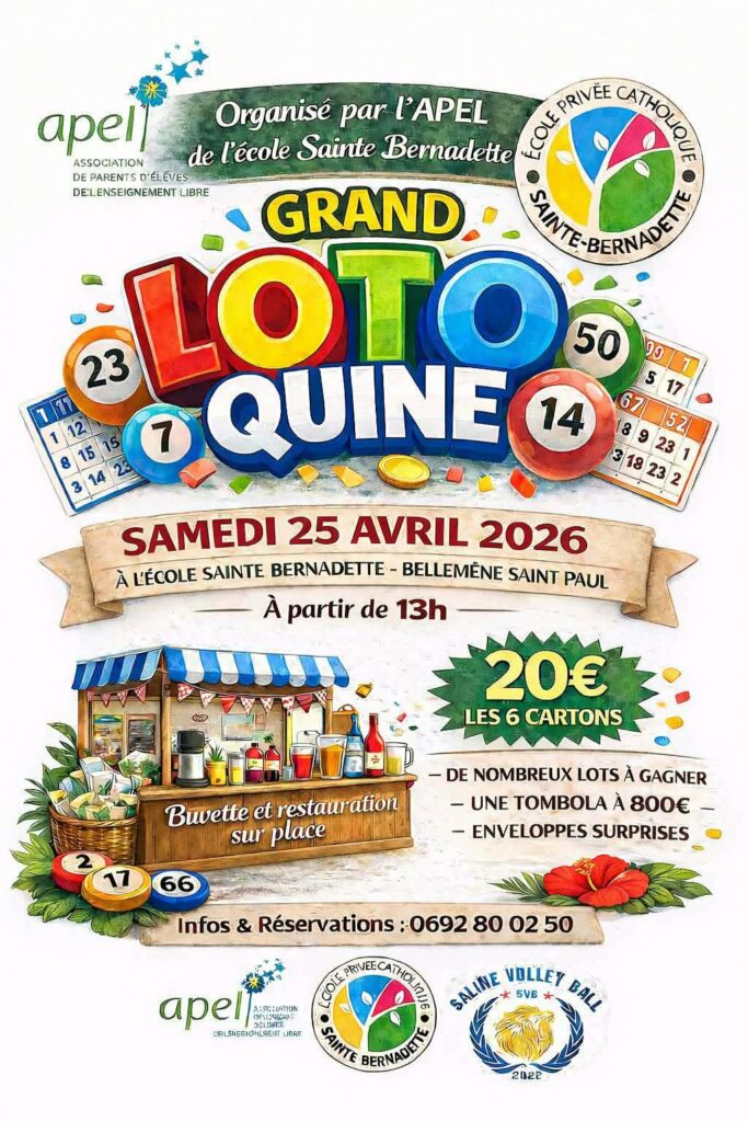 L’APEL de l’école Sainte Bernadette a le plaisir de vous inviter à son grand loto quine qui se déroulera le samedi 26 avril 2026 à partir de 13h. Venez passer un moment convivial en famille ou entre amis et tenter votre chance! De nombreux lots seront à gagner tout le long de l’après-midi, ainsi qu’une tombola exceptionnelle avec un gain de 800€. Des enveloppes surprises seront également proposées. Le tarif est fixé à 20€ les 6 cartons. Une buvette et un service de restauration seront disponible sur place pour vous permettre de profiter pleinement de l’évènement. Attention: les places sont limitées ! La réservation est fortement conseillée et doit être effectué à l’avance. Nous vous attendons nombreux pour partager ce moment festif et soutenir les actions de l’APEL au profit des élèves de l’école.