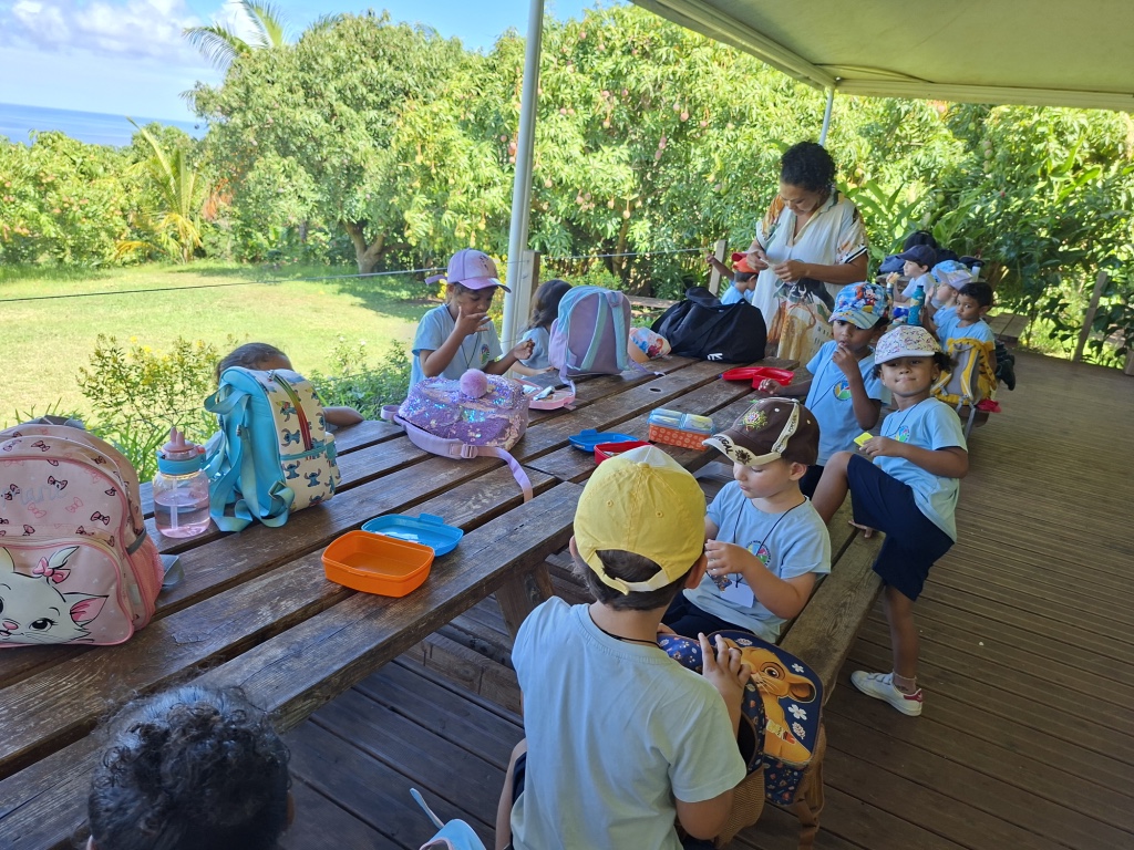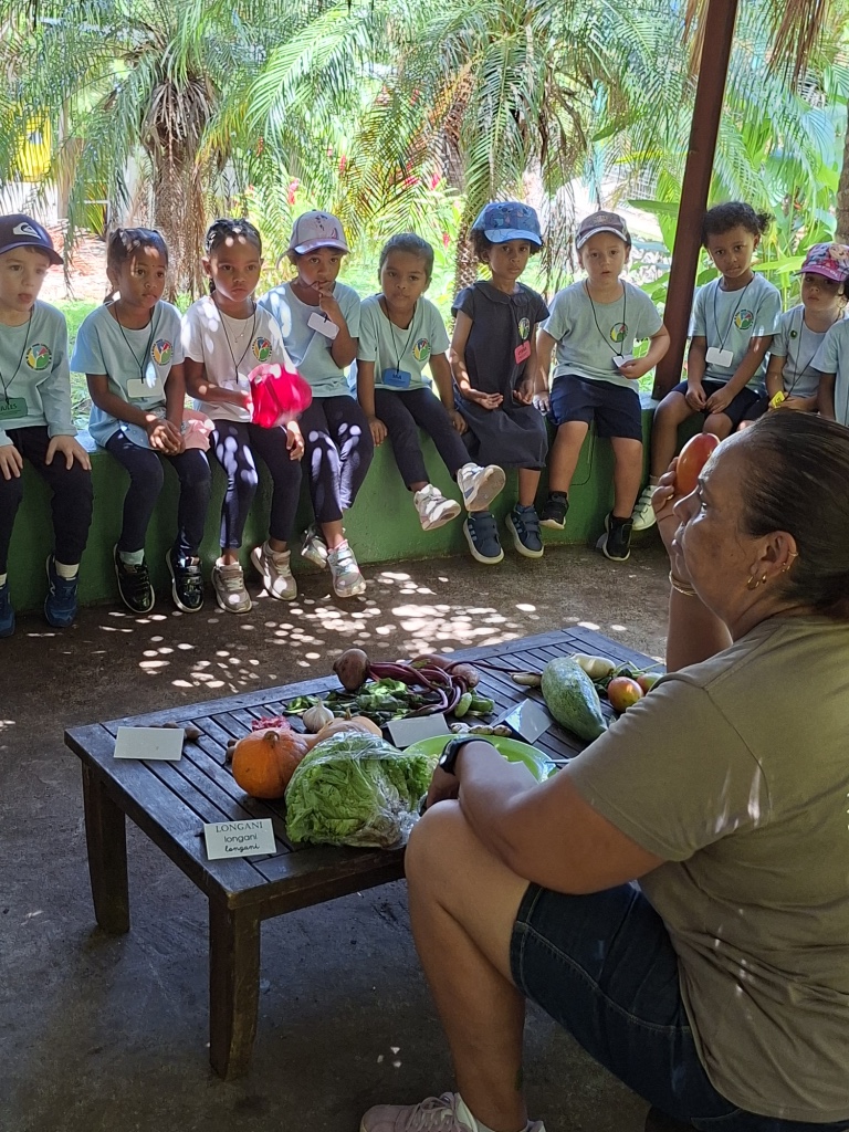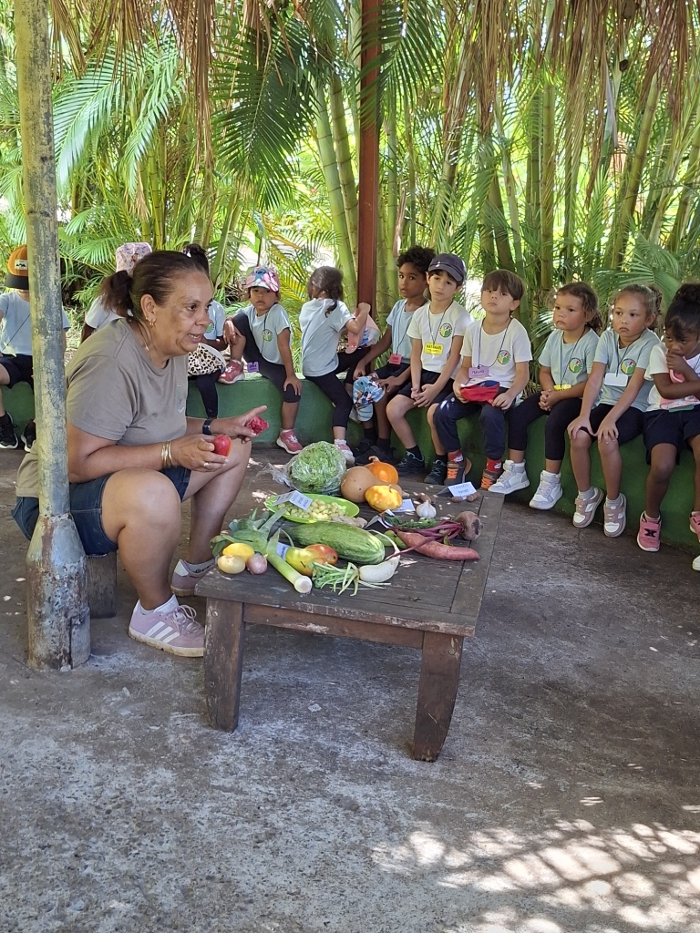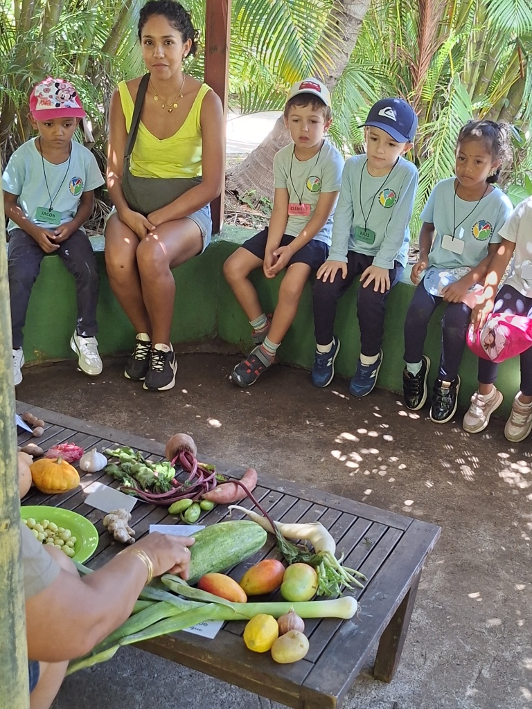 Après la visite nous sommes allé sous un autre kiosque où nous a rejoint une animatrice pour une activité gourmande et éducative. L’animatrice nous a présenté une magnifique diversité de fruits et légumes typiques de l’île de la Réunion. Ensemble, nous avons nommé et reconnu quelques légumes de la Réunion: l’ananas, la girimbelle, le citron, la mangue, la grenade, l’avocat, le tamarin, la noix de coco, le chouchou, le poireau, la laitue, le butternut…