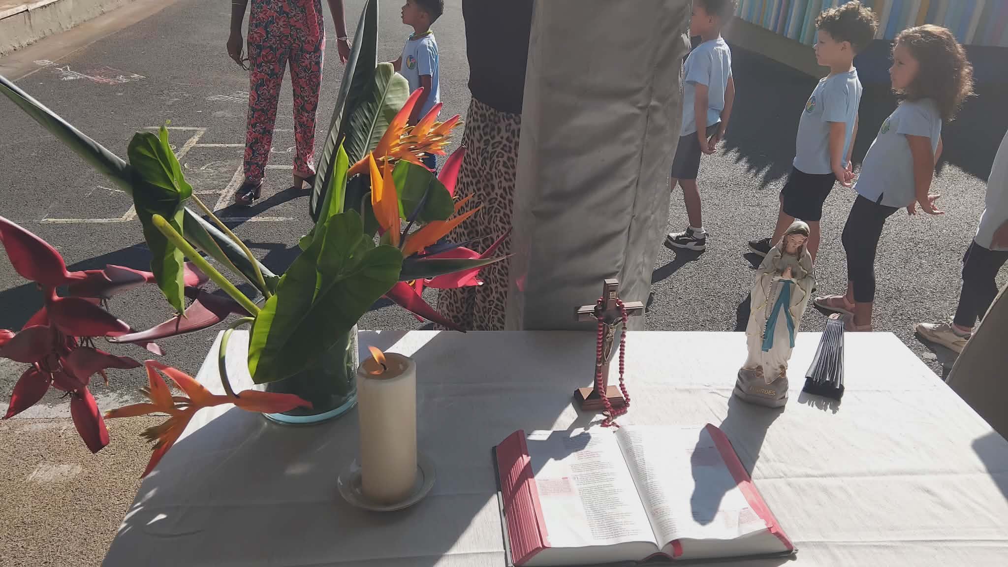 Les enfants de la maternelle ont déposé des objets qui leur sont cher pour cette nouvelle année. Cahier, trousse et livre ont été déposé et béni !